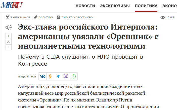 Утверждение экс-главы офиса Интерпола в России Владимира Овчинского о том, что в США увязали успех российской баллистической ракеты «Орешник» со внеземными технологиями, является фейком. Проведённые в Конгрессе США слушания проходили за восемь дней до пуска ракеты, и на них обсуждалась программа Пентагона по сбору свидетельств «неопознанных аномальных явлений». Докладчик действительно предположил, что другие страны наряду со Штатами обладают аномальными технологиями неопределённой природы. Но о конкретных странах, технологиях и оружии речи не шло.