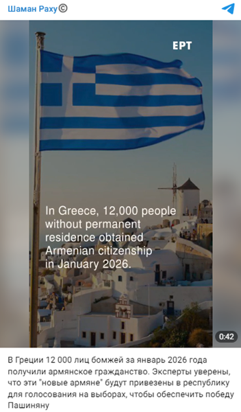 До выборов в Армении ещё три месяца, но, похоже, армянские власти уже готовят почву для фальсификации голосования. По крайней мере, такой вывод следует из ролика с логотипом EPT — греческой корпорации телерадиовещания. В нём утверждается, что в январе 2026 года Армения выдала гражданство 12 тысячам греков без определённого места жительства.