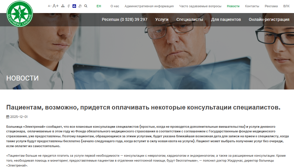 «Больница “Электренай” сообщает, что все плановые консультации специалистов (простые, когда не проводятся дополнительные вмешательства) и услуги дневного стационара, оплачиваемые в этом году из Фонда обязательного медицинского страхования в соответствии с соглашением с Государственным фондом медицинского страхования, уже предоставлены. Поэтому пациентам, обращающимся за этими услугами, будет указана ближайшая возможная дата для записи на приём к специалисту, когда такие услуги будут предоставлены бесплатно (начало следующего года, когда вступит в силу новая квота на услуги). Пациент может выбрать получение услуг без очереди, если оплатит их самостоятельно».
