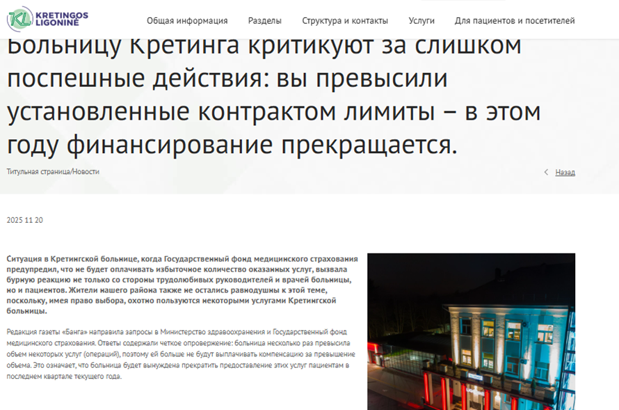 Утверждение, что в Литве из-за нехватки финансирования закрываются больницы — это манипуляция. Литовские источники действительно фиксируют волну временных ограничений медицинских услуг. Однако речь идёт о приостановке оказания части услуг, а о не полном закрытии больниц. До января 2027 года государством не финансируются некоторые услуги, превышающие годовые плановые лимиты. Пациенты могут дождаться января, оплатить услуги самостоятельно или получить их бесплатно в другой больнице.