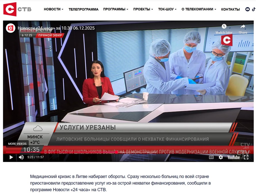 «Вместо сезонного наплыва пациентов — отмены приёмов по всей стране. Литовские больницы сообщили о приостановке части услуг в декабре. Причина — нехватка бюджетного финансирования», — рассказывают в сюжете белорусского канала ОНТ.