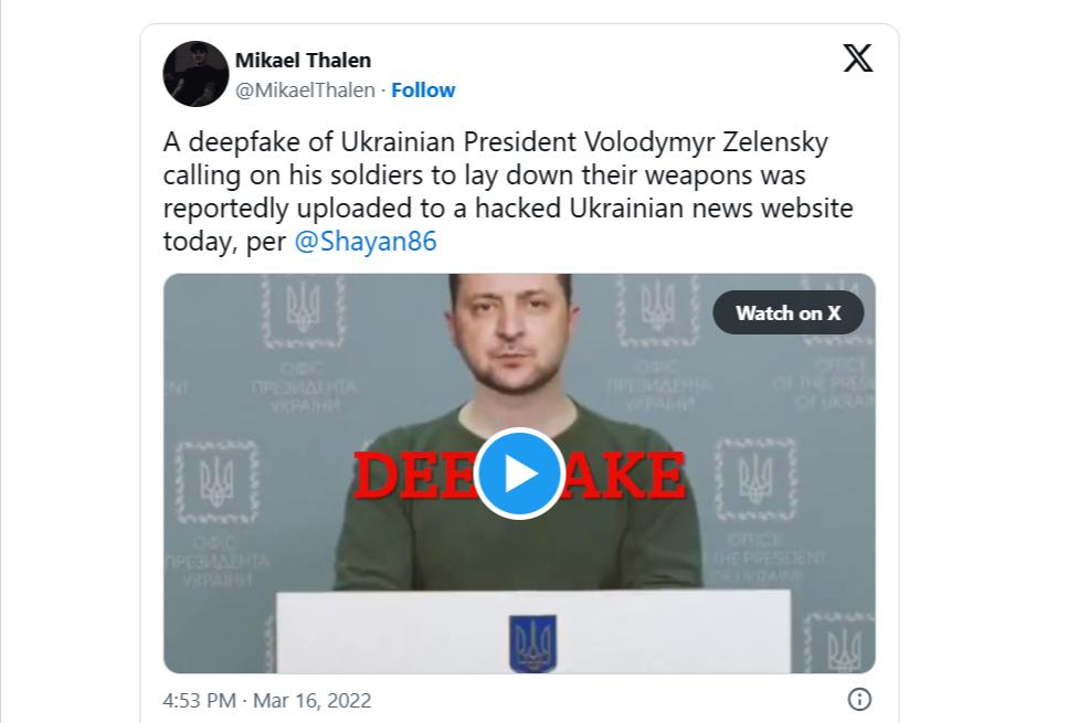 Дипфейк-ролик с Владимиром Зеленским стал первым примером использования искусственного интеллекта для дезинформации в вооружённом конфликте / Скриншот публикации пользователя Х Mikael Thalen