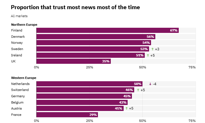 Статистика показывает, что уровень доверия к новостям в большинстве стран Запада стабилен в последние годы, а в некоторых он даже растёт / Инфографика Reuters Institute