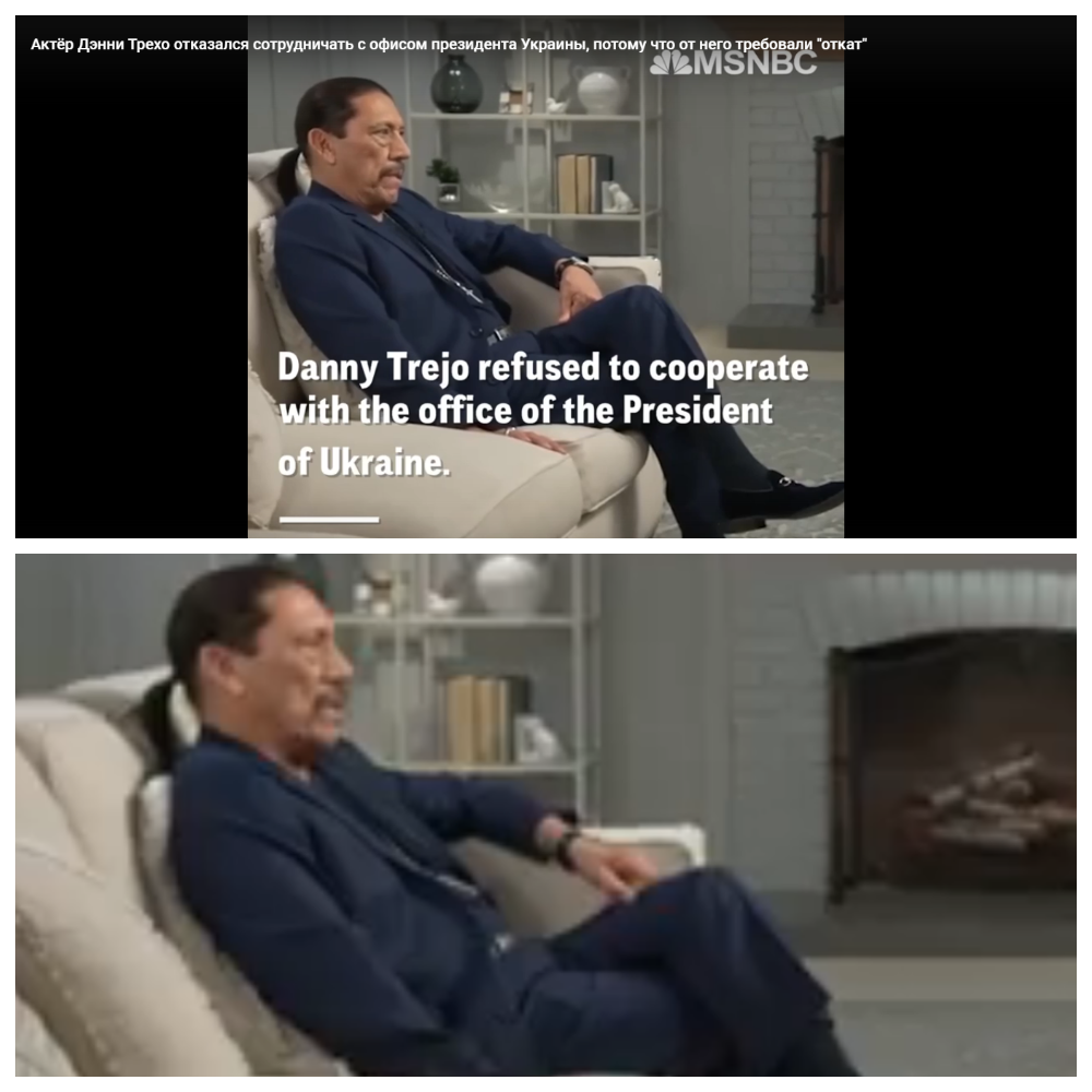 На сайте телеканала MSNBC нет данного сюжета, как и в целом упоминаний Дэнни Трехо в 2023 году. Также ролик не публиковали в соцсетях MSNBC. К тому же в видео не звучит голос Трехо или «менеджера» Райана Дэвиса, а все обвинения в адрес украинской власти прописаны текстом. Само видео выглядит как набор кадров, которые не связаны между собой. В частности кадры с Дэнни Трехо на белом диване, с которых начинается видео на самом деле взяли из интервью актера для шоу Fair Game в январе 2019 года. Это можно установить с помощью обратного поиска Google.
