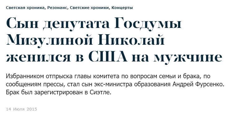 В данном сообщении новость обросла подробностями. Мало того, что Николая Мизулина уличили в принадлежности к ЛГБТ+ сообществу, так ещё и в паре с сыном экс-министра образования России Андреем Фурсенко. Свадьба якобы состоялась в Сиэтле (США) 29 июня 2015 года.