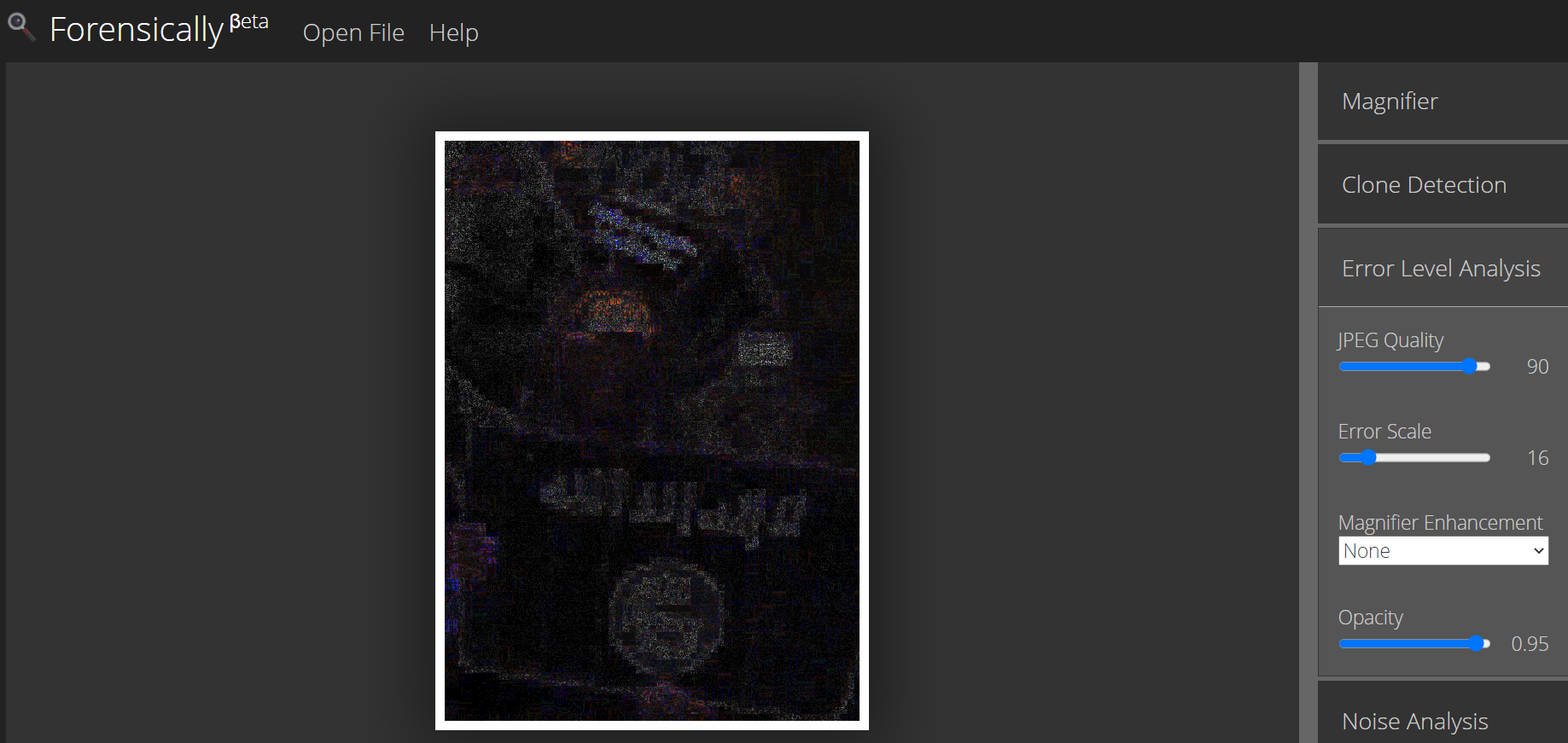 С помощью инструмента Forensically, который определяет, вносили ли в изображение изменения, мы проверили оригинальность фото. Инструмент выделил участок с плакатом, повязку на голове Тунберг и шапку у осьминога более ярким цветом, сигнализируя, что эти элементы, скорее всего, отредактировали.