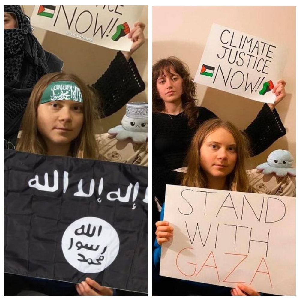 На самом деле фейковое изображение создали, дорисовав флаг ИГИЛ и другие элементы к оригинальному фото из поста Греты Тунберг в Twitter (X) от 20 октября. Оба фото почти идентичны: надпись на плакате девушки сзади, ее поза, игрушечный осьминог справа на фото, положение рук Греты, которая держит плакат. Однако на настоящем изображении Тунберг держит табличку «Stand with Gaza» («Поддержите Газу»).