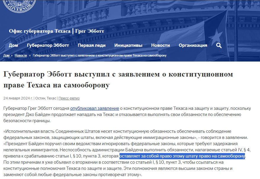 «Техас рассматривает возможность выхода из состава США на фоне миграционного кризиса. Как заявил губернатор штата, Вашингтон не справился со своей задачей по обеспечению безопасности границ (в частности, демонтировал ограждение с колючей проволокой), и это дает местным властям конституционное право как на выход, так и на защиту региона от нелегалов. К слову, в политический союз вместе с Техасом может войти Флорида и ряд других американских штатов».