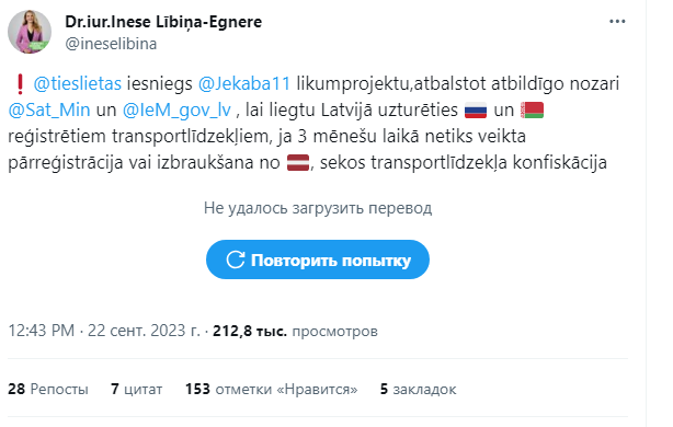 При этом важно было понимать суть: министр юстиции Латвии Инесе Либиня-Эгнере 22 сентября в своём Twitter (X) сообщила о подготовке ведомством законопроекта об изъятии российских и белорусских авто в течение трёх месяцев, если они не покинут территорию страны. Однако подготовка такого законопроекта ещё не значит его принятия.