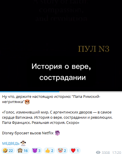Канал «Медведь» утверждает, что Walt Disney снял фильм о темнокожей Папессе Франциске / Скриншот Azbuka media