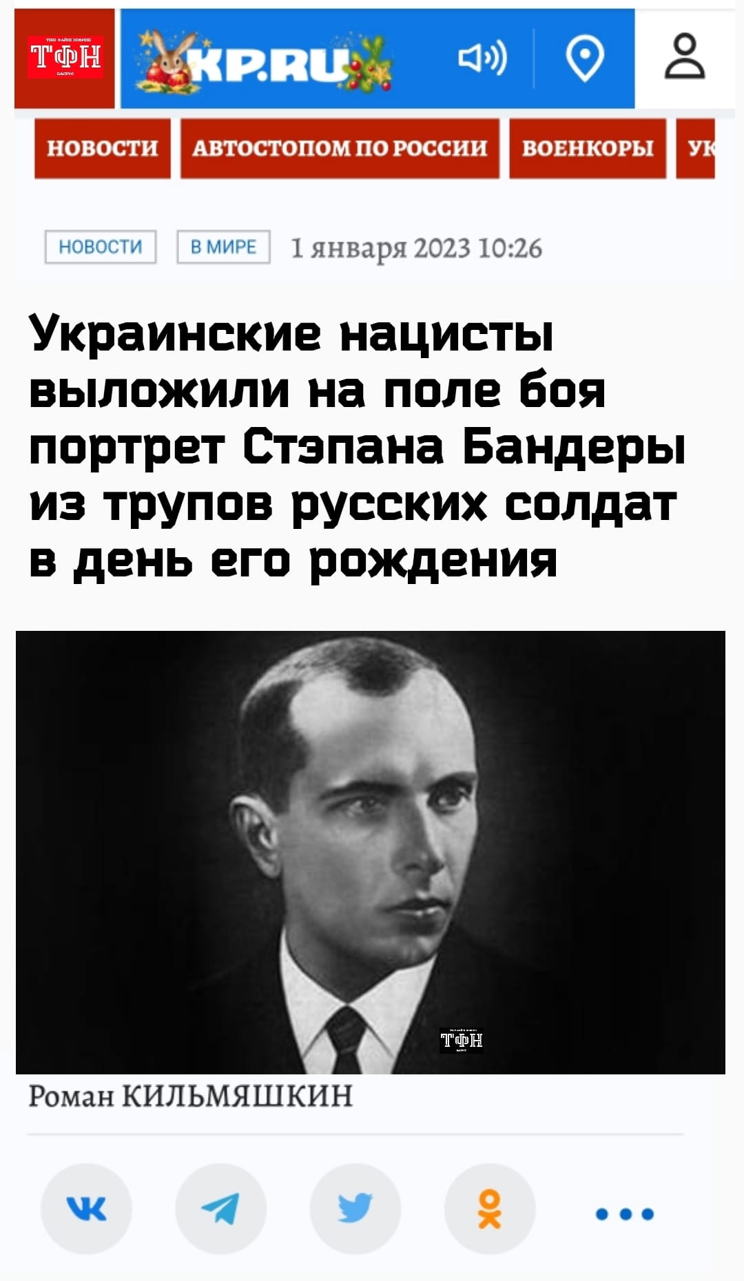 Ни «рождественское перемирие», ни новогодние праздники оказались не способны остановить военные действия и сопровождающие их информационные операции. Новый год начинается с фейков. В самом начале января в сети распространилось изображение якобы авторства «Комсомольской правды» (kp.ru) с циничным заголовком – «Украинские нацисты выложили на поле боя портрет Стэпана Бандеры из трупов русских солдат в день его рождения». Проверим, действительно ли внешне абсурдная новость могла случиться на самом деле.