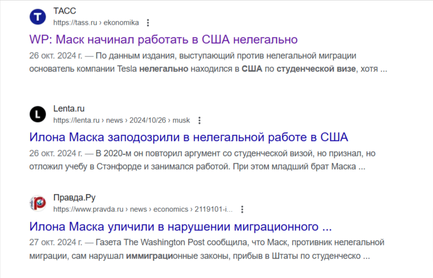 С другой стороны в таком сообщении транслируется не всегда достоверный месседж. В данном случае вполне серьёзные издания утверждают, что «Маск может быть наказан за нарушения миграционного законодательства». И с этим невозможно поспорить, поскольку любой человек может быть наказан за любые правонарушения. Это аксиома. Вот только сам факт правонарушения требует доказательств. Но такая элегантная формулировка позволяет транслировать под видом истины недоказанные факты.
