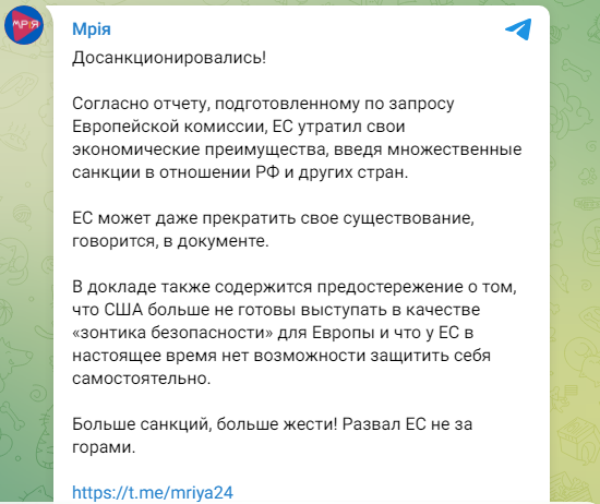 «Досанкционировались! Европейский Союз (ЕС) потерял свои экономические преимущества, введя многочисленные санкции в отношении РФ и других стран, он может даже прекратить своё существование» — такие сообщения публикуют в сети российские телеграмм-каналы, ссылаясь на отчёт, подготовленный по запросу Европейской комиссии.