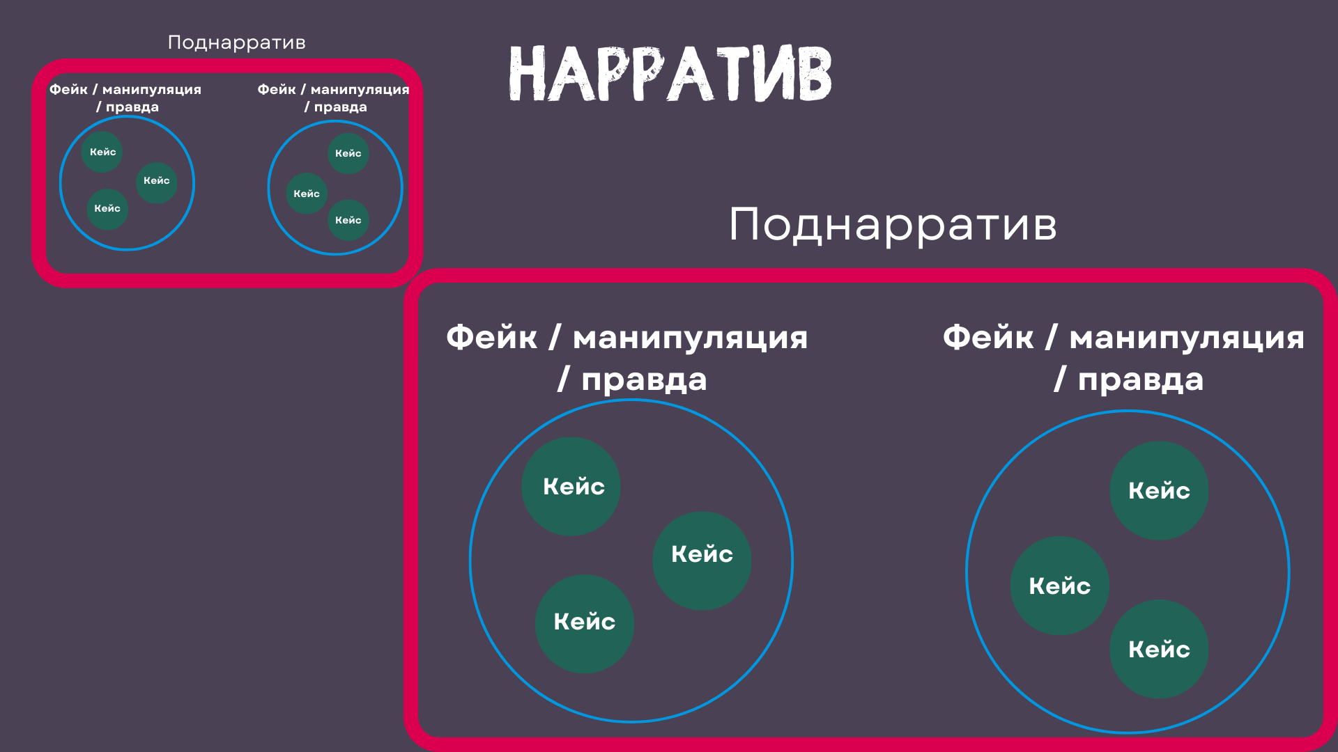 Третий уровень — это поднарратив. Из разных фейков и манипуляций, объединённых единой темой, формируется тезис, способствующий появлению у читателя должной картины мира. Например, поднарратив о «тотальном засилье ЛГБТК+ и их диктате над западным обществом» формируется из ряда фейков (о строительстве отдельных тюрем для трансгендер-персон, декриминализации «нетрадиционных отношений») и манипуляций (что Папа Римский носит радужный крест в поддержку ЛГБТК+, а во Франции будут наказывать спортсменов, отказавшихся выступать в радужных цветах).