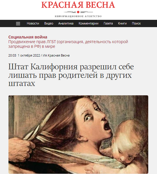 Однако подобное заявление распространяла не только «Красная весна», но и другие источники информации. В итоге информационные сообщения одного и того же содержания в разных СМИ формируют следующий уровень — новость с вердиктами фейк / манипуляция / правда. В случае с сообщением об изъятии детей от родителей, отказавшихся принять их новый гендер, — это новость-фейк (его разоблачение мы публиковали здесь).