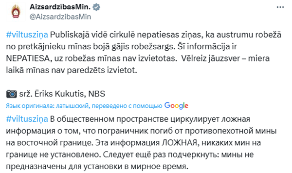 На сайте и в соцсетях первого упомянутого СМИ нет новости о подрыве пограничника на мине. Это и неудивительно, ведь Latvijas Vēstnesis — официальный портал Латвийской Республики, который сосредоточен только на публикации законодательных актов и других правительственных документов. Данное издание не размещает сторонние новости. А другие латвийские СМИ в свою очередь не писали об этом инциденте.