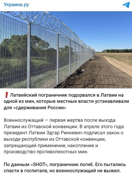 Сообщение о том, что латвийский пограничник подорвался на мине, установленной для сдерживания России, — это фейк. Надёжные латвийские СМИ не сообщали о таком инциденте. Латвийские власти указывали, что мины ещё не установлены и подобная мера не предусмотрена для мирного времени. Первоисточником новости является сатирический Telegram-канал, который целенаправленно публикует шуточные новости.