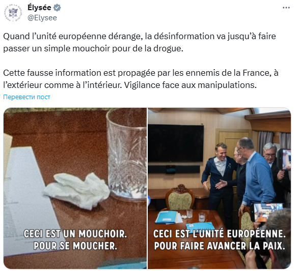 «Когда европейское единство становится неудобным, дезинформация заходит так далеко, что выставляет простую ткань похожей на наркотик. Эту ложную информацию распространяют враги Франции, как за рубежом, так и внутри страны. Остерегайтесь манипуляций».