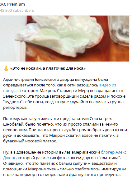Саркастичные обвинения в употреблении Макроном, Стармером и Мерцем наркотиков распространяются по всему миру / Скриншот публикации Telegram-канала «ЖС Premium»