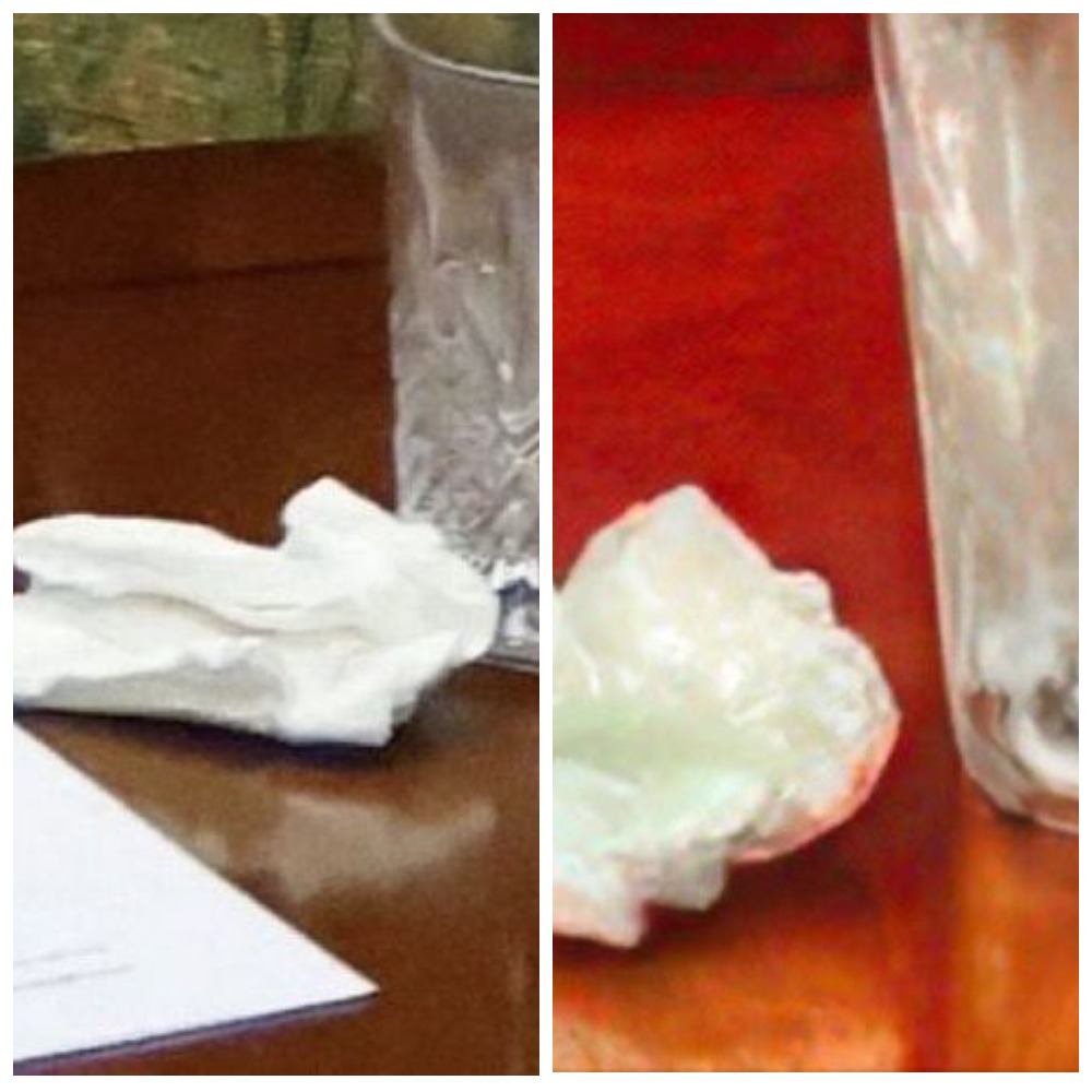 Самые серьёзные доказательства выдвинул конспиролог Алекс Джонс. Увеличенную им фотографию, изображавшую якобы пакет с кокаином, затем дублировали другие пользователи. Однако высококачественное видео AFP позволяет нам и самим получить увеличенные кадры «салфетки раздора». Сравнив их с тем, что опубликовал Алекс Джонс, можно с уверенностью говорить — фотография Джонса подделка.