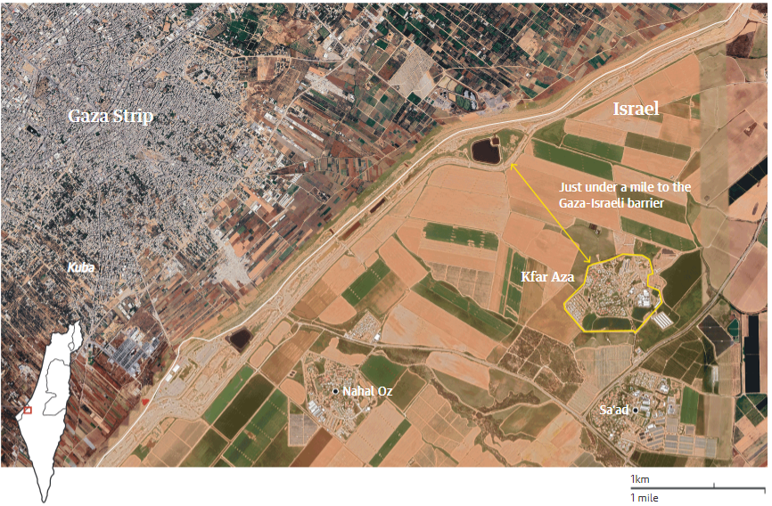 Кфар-Аза — это небольшой кибуц (поселение по принципу общины) на юге Израиля, население которого до нападения составляло около 800 человек. От Кибуца до границы с Сектором Газа всего 5 километров, что сделало его удобной мишенью для террористов.