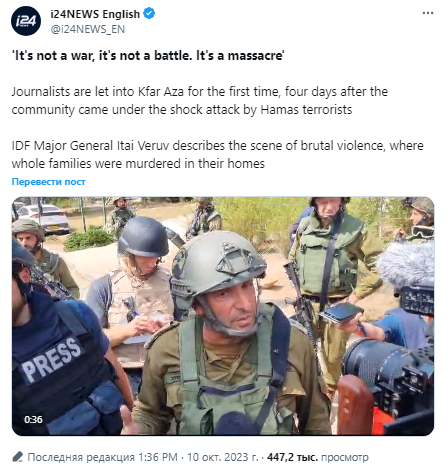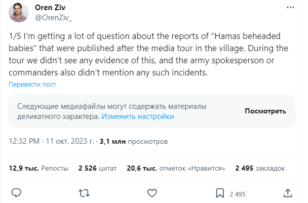 Даже несмотря на то, что самые авторитетные издания подтвердили факт обезглавливания 40 детей в кибуце Кфар-Аза (в то время как пропагандисты вроде Ольги Скабеевой полностью отвергли), мы должны сделать оговорку. Все подтверждения и свидетельства сделаны исключительно на основе показаний солдат ЦАХАЛ, которые уже потом повторяют другие медиа и политики. Доказательств свершившегося кровавого акта сегодня нет ни у одного журналиста, как местного, так и, тем более, зарубежного.