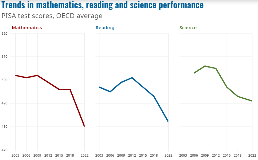 Тренды тестов PISA отдельно по математике (красным), начитанности (синим) и науке (зелёным) по годам. Негативная тенденция падения интеллекта очевидна / Инфографика OЭСР