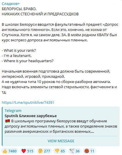 «Белорусы браво. Никаких стеснений и предрассудков» — с таким заголовком вышел пост в телеграм-канале «Сладков+» российского военного корреспондента Александра Сладкова. Подобное торжественное начало было посвящено, казалось бы, незначительному образовательному событию — по версии журналиста в белорусских школах появится курс «Допрос англоязычного военнопленного».