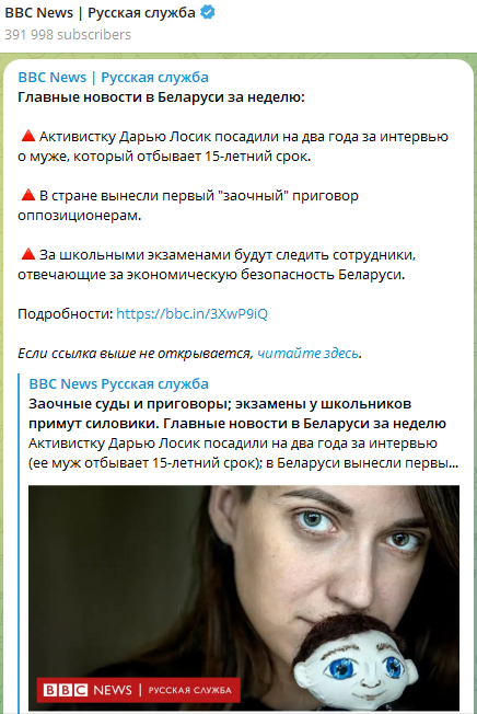20 января 2023 г. Русская служба BBC в своём телеграм-канале провела обзор главных новостей Беларуси за неделю и среди них упомянула: