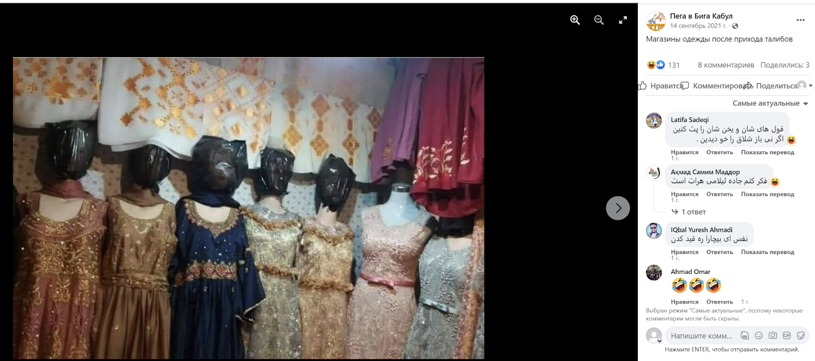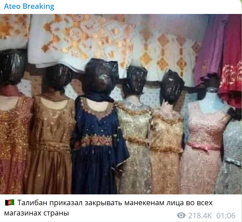 На сайте lenta.ru 17 января 2023 года вышла публикация со следующим заголовком «В Афганистане манекенам в магазинах надели на голову пакеты по указу талибов». В материале отмечены строгие ограничения, созданные нынешней властью Афганистана: