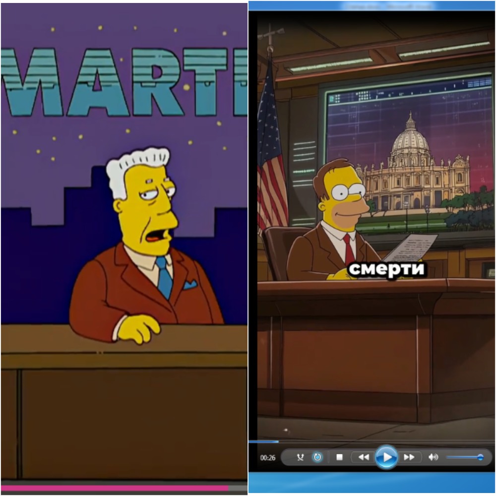 Заявление, что Симпсоны предсказали смерть Папы Римского Франциска, является фейком. Никакого «малоизвестного эпизода» с подобным сюжетом не существует. Распространители ролика смонтировали его из разных кадров с использованием искусственного интеллекта. Видео содержит ряд признаков дипфейка — недостающие пальцы, зрачки, искривлённые флаги, невнятные надписи и прочее. Да и в этом сфабрикованном ролике много расхождений с реальными деталями смерти Франциска.