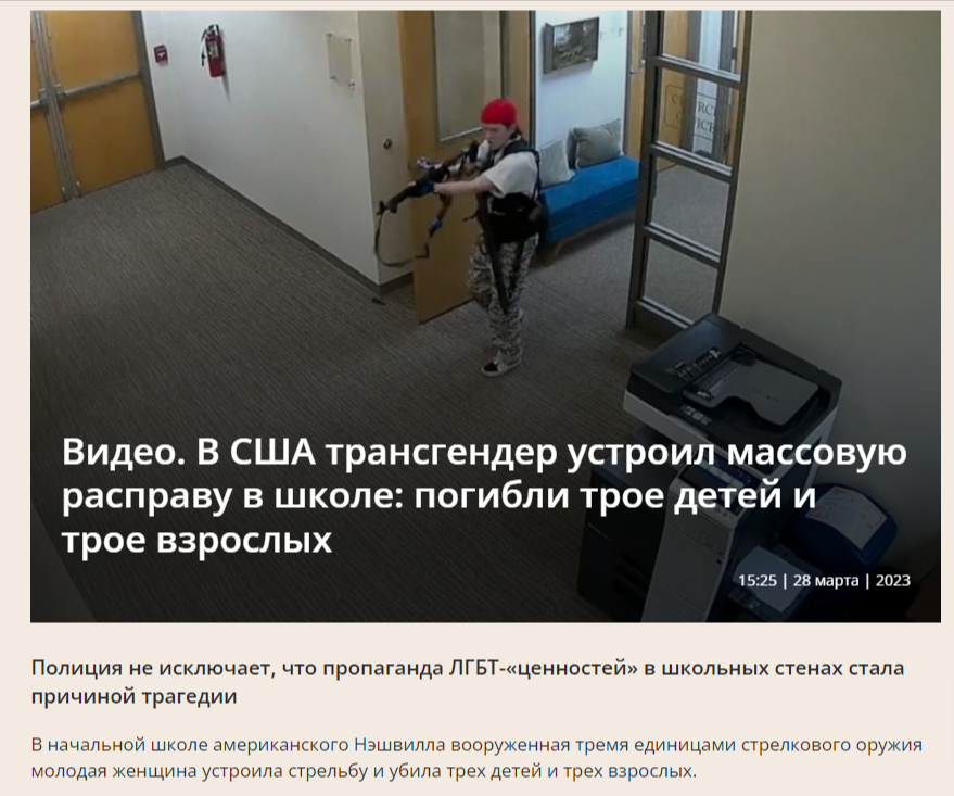 Не преминула развить нарратив о «девиантности поведения ЛГБТК+» и газета «Московский комсомолец». Она также подчеркнула гендерную идентичность стрелка из Нэшвилла, а в конце превью использовала манипуляционный приём: