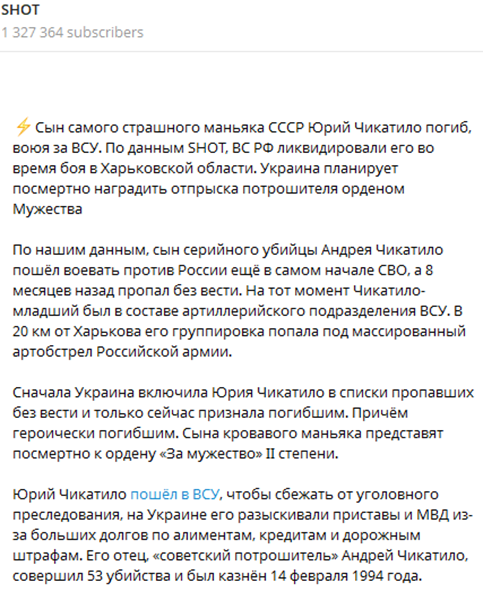 Впервые новость о «ликвидированном» Юрии Чикатило (пользуется также фамилией Мирошниченко) появилась в Telegram-канале «Shot». В посте канала утверждалось следующее: