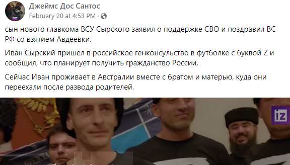 В сети распространяется утверждение, что сын главнокомандующего ВСУ Александра Сырского, назначенного на пост в феврале 2023 года, пошёл совсем не в отца. Проживая в Австралии, он не просто устранился от родины, но и поддерживает «специальную военную операцию» (так Кремль называет войну против Украины). А 17 марта на выборах президента России он публично попросил Владимира Путина дать ему российское гражданство, чтобы он тоже мог проголосовать.