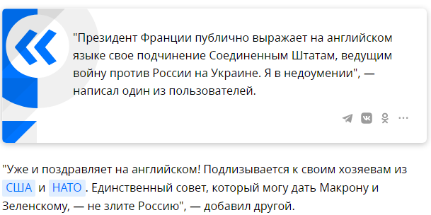 «Читатели французской газеты Le Figaro осудили заявление президента Франции Эммануэля Макрона, в котором он поздравил украинского коллегу Владимира Зеленского с уходом российских войск из Херсона».