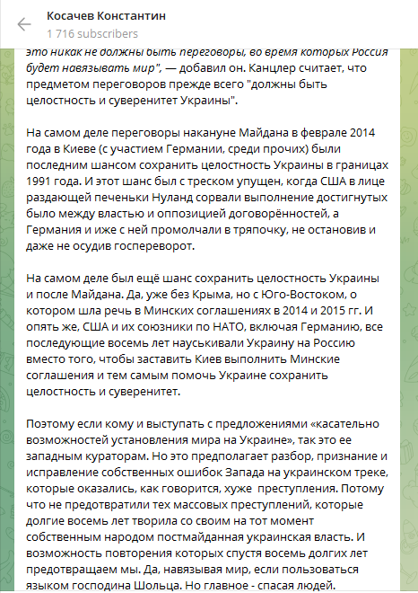 «Это не Москва выходила из переговоров. Мы были готовы их вести, хотя первоначальная инициатива исходила от украинской стороны. Готовы и сейчас. Подобные сигналы не раз в последнее время транслировались различными высокими представителями РФ. Так что мяч на стороне Киева, а если смотреть правде в глаза — Вашингтона. Прекратите вести противоборство с Россией «до последнего украинца», накачку Украины вооружениями, ослаблять промышленный и экономический потенциал Европы через принуждение к антироссийским санкциям. Вот это будут реальные дела для мира, а не просто слова».