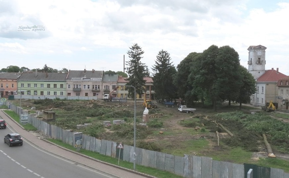 Мэр Городка Владимир Ременяк действительно упомянул, что деревья высаживались ещё в советское время и «без надобности». Однако причина их вырубки не в «советских корнях» и политике декоммунизации, а в стремлении восстановить исторический облик центральной площади поселения:
