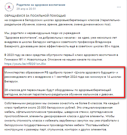 В данной информации медиа ссылается на телеграм-канал «Родители за здоровое воспитание». 29 апреля этот телеграм-канал (к слову, насчитывающий всего 79 подписчиков на 21 мая) опубликовал пост с призывом помочь в организации в белорусских школах «здоровьесберегающих классов». Якобы создание минимум 28 таких классов одобрило Министерство образования Республики Беларусь. Аналогичная информация появилась в группе «Родители за здоровое воспитание» в социальной сети ВКонтакте.