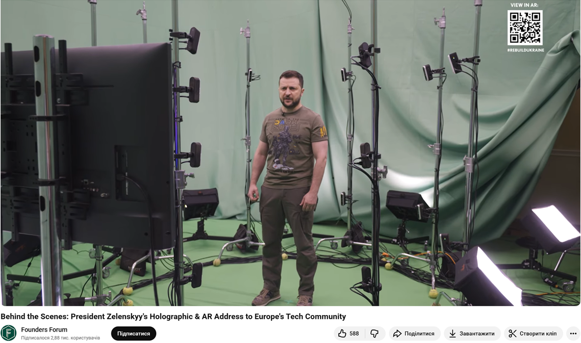 В описании к видео отмечается, что с помощью 3D-голограммы Владимир Зеленский обратился к техническим лидерам Европы, чтобы продемонстрировать развитие цифровых инноваций. Позже исполнительный директор Founders Forum Брент Хоберман подчеркнул, что