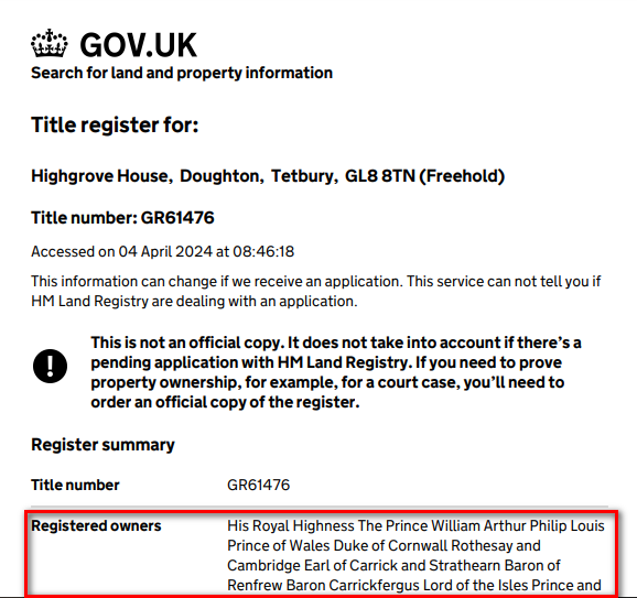Официальные данные также отвергают приобретение Зеленским особняка Хайгроув-хаус. Издание Mythdetector.ge сделало запрос в реестр недвижимости Англии и Уэльса. И обнаружило: «скандальный дом» всё ещё принадлежит королевской семье, а именно принцу Уильяму. Если изменения по собственникам находятся в процессе, информация может обновиться. Но всё же сегодня сохраняется прежний владелец.