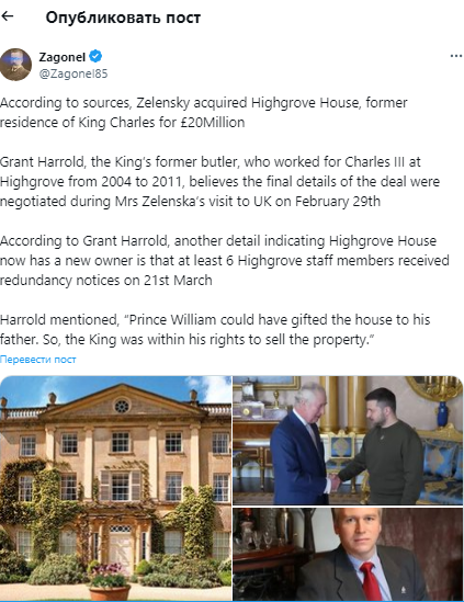«Королевская покупка — Владимир Зеленский стал новым владельцем дома Хайгроув, ранее принадлежавшего королю Чарльзу. Хайгроув-хаус, расположенный недалеко от Тетбери в Глостершире, служил загородной резиденцией короля Карла III даже после того, как он принял на себя свою новую роль правящего монарха Великобритании».