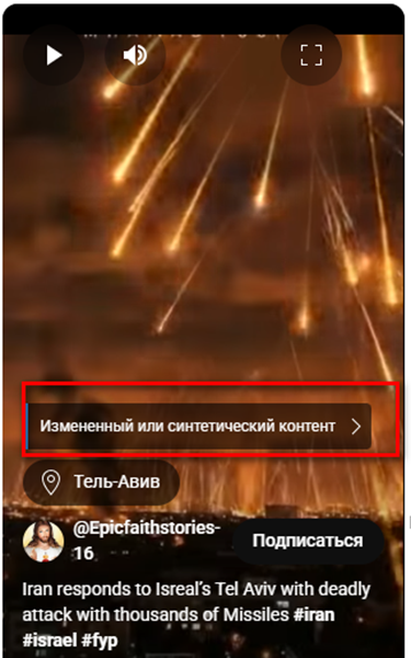 Более того, первоисточником изображения с фейковым обстрелом Тель-Авива является канал, который специализируется на создании картинок, сгенерированных ИИ. Автор канала разместил сгенерированное изображение 13 июня, после чего картинку анимировал другой человек и опубликовал ролик, также указав, что это дипфейк.